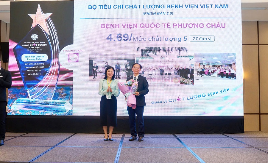TS.BS Nguyễn Minh Hiệp - Giám đốc Quản lý chất lượng chuyên môn, Tập đoàn Phương Châu nhận hoa chúc mừng từ đại diện lãnh đạo Sở Y tế thành phố Cần Thơ chúc mừng Bệnh viện Quốc tế Phương Châu - Đơn vị đạt điểm Chất lượng bệnh viện cao nhất (trong 27 đơn vị y tế thành phố) theo Bộ 83 tiêu chí đánh giá chất lượng bệnh viện.
