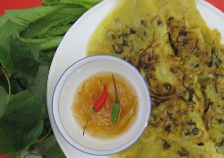 Lửa hồng đã chuẩn bị. Với những động tác nhanh gọn, má bắc chảo lên bếp, cầm cọng chuối (đập giập một đầu cho mềm như cây cọ) nhúng vào tô mỡ và thoa đều trong lòng chảo, cho ốc cùng củ hành tây xắt mỏng vào xào vừa chín, và dùng vá múc bột đổ vào chảo (để ốc kết dính với bột). Kế đến, má nhắc chảo lên và xoay vòng một cách nhẹ nhàng cho bột tráng đều thành một hình tròn, mép bánh không bị rách. Tuần tự, má cho củ sắn, giá, hẹ vào sau. Đợi cho các nguyên liệu trên chín hẳn, má dùng xạng gấp bánh làm đôi và xúc ra đĩa. Chỉ cần làm thêm chén nước mắm chanh tỏi ớt (có dưa chua củ cải trắng, củ cải đỏ xắt sợi) cùng đĩa rau sống (cải bẹ xanh, xà lách, đọt bằng lăng, đọt bứa, rau thơm, dưa leo…) dọn ra bàn.